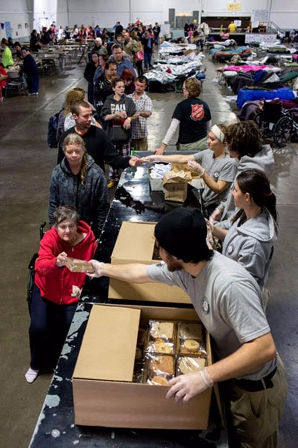 Lunch, consisting of soup and sandwiches, is served at the Silver Dollar Fairgrounds shelter in Chico, CA on Thursday, February 16. Volunteers from the Salvation Army and AmeriCorps prepared and served the meal in the Red Cross managed shelter.