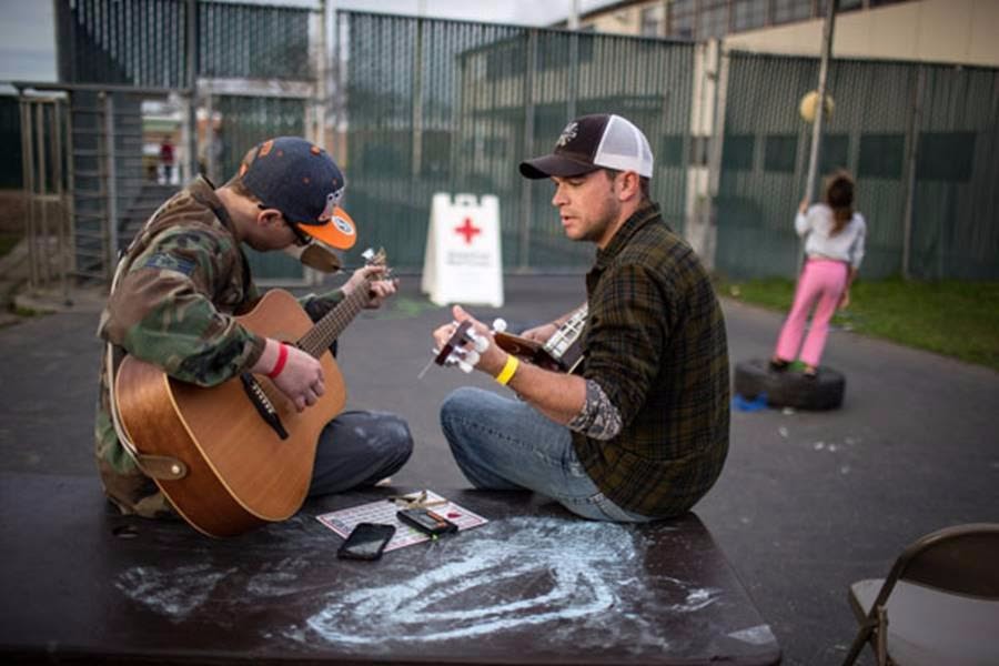 Joe and Eric jam out at the Red Cross Oroville Dam relief shelter in Chico, CA. Eric evacuated his home in Oroville with his guitar and banjo, and was happy to find another musician to play with. “When they told us to take everything, of course I brought my guitar,” Eric lightheartedly shared.