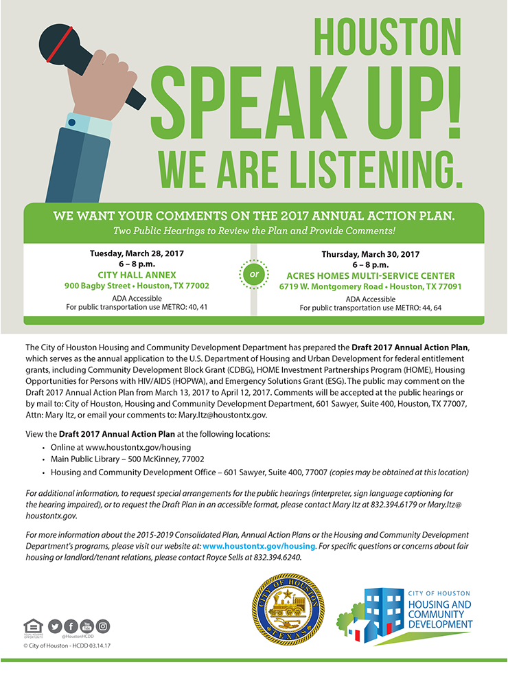 The City of Houston Housing and Community Development Department has prepared the Draft 2017 Annual Action Plan, which serves as the annual application to the U.S. Department of Housing and Urban Development for federal entitlement grants, including Community Development Block Grant (CDBG), HOME Investment Partnerships Program (HOME), Housing Opportunities for Persons with HIV/AIDS (HOPWA), and Emergency Solutions Grant (ESG).