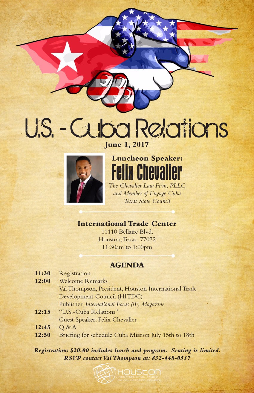 Would you like to know about U.S. Cuba Relations? Then join us for lunch June 1st at the International Trade Center. Our guest speaker is Felix Chevalier a first generation Cuban American and managing partner of Chevalier Law Firm. Also member of the Engage Cuba Texas Council.