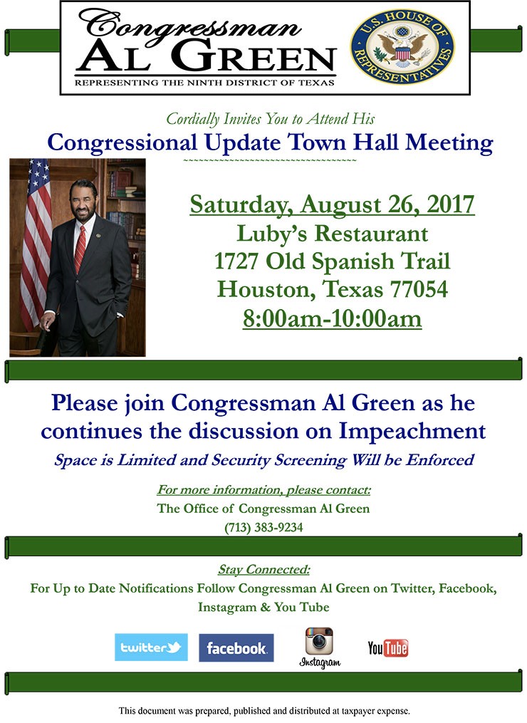 Congressman Al Green will have a town hall this Saturday for Congressional Updates. We hope to see you at the town hall for information of current legislation.