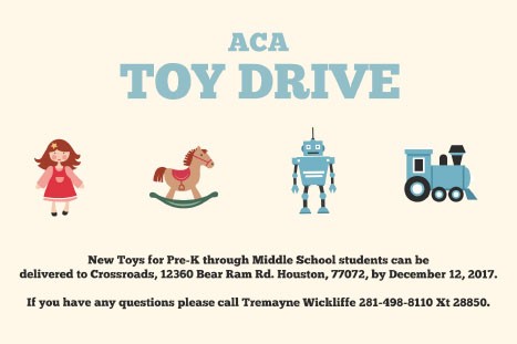 Toys can be delivered to Crossroads HS, 12360 Bear Ram Rd. Houston, 77072.