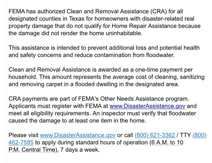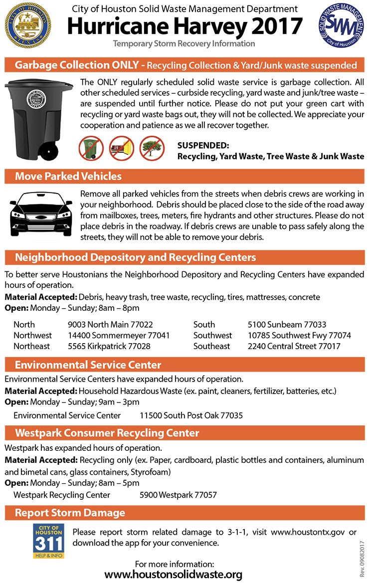 FEMA has opened up a Disaster Recovery Center at Bayland Community Center (6400 Bissonnet). The center will be open from 7am – 7pm, 7 days a week. You can apply for federal assistance, receive information about resources available and ask for updates on your case at the center.
