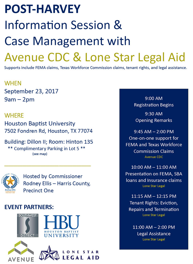 Supports include FEMA claims, Texas Workforce Commission claims, tenant rights, and legal assistance.