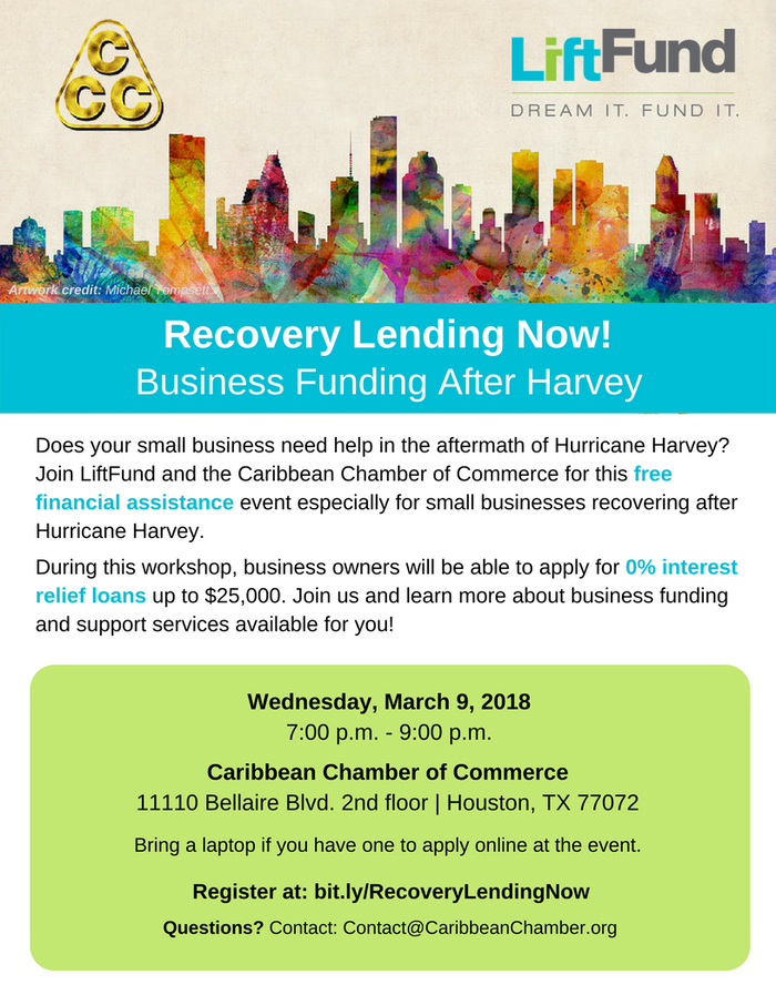 Does your small business need help in the aftermath of Hurricane Harvey? Join LiftFund and the Caribbean Chamber of Commerce for this free financial assistance event especially for small business recovering after Hurricane Harvey.