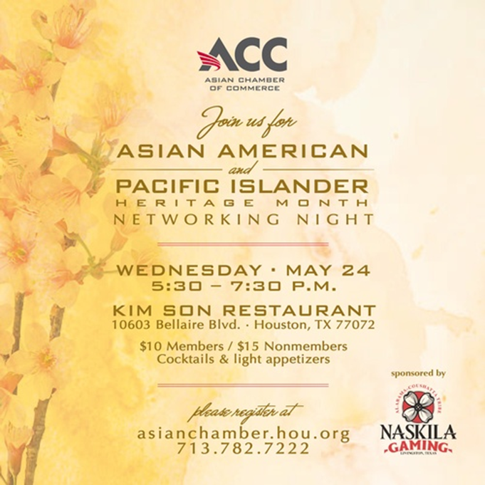 Wednesday May 24 from 5:30 to 7:30 PM. Please register at AsianChamber.hou.org