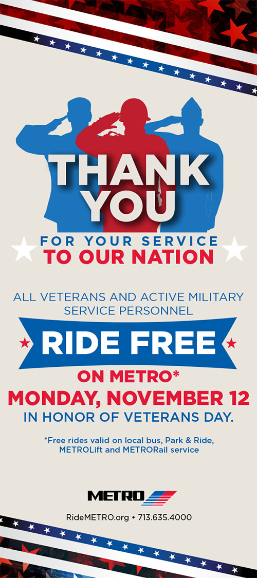 All veterans and active military service personnel ride free on METRO Monday, November 12, in honor of Veterans Day.