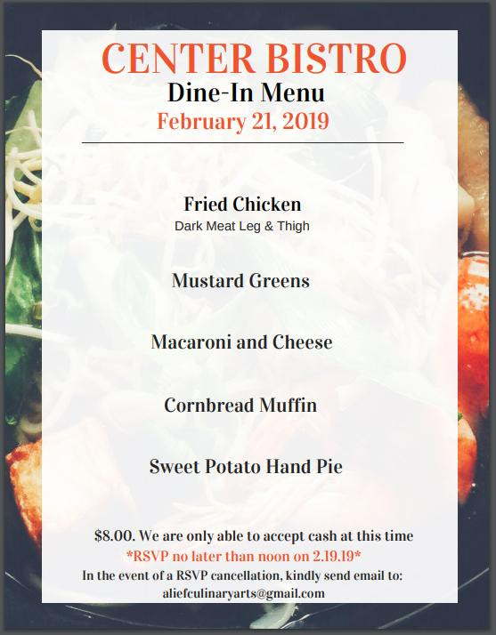 The Bistro at the Center for Advanced Careers is taking reservations for lunch on February 21. Service is from 11:00 a.m. until Noon and you must have a reservation. The address for the Center for Advanced Careers is 12160 Richmond Avenue.