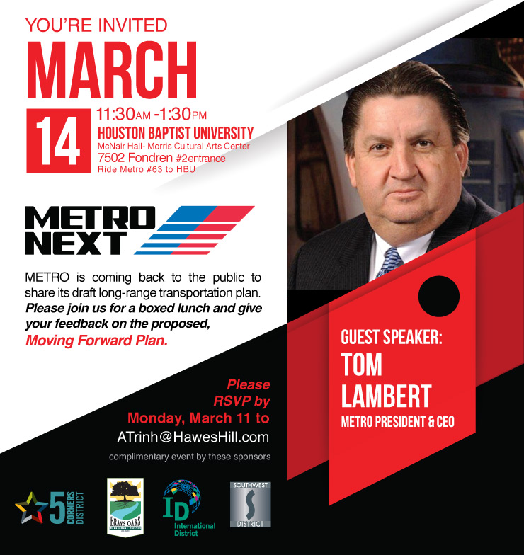 METRO is coming back to the public to share its draft long-range transportation plan. Please join us for a boxed lunch and give your feedback on the proposed Moving Forward Plan.