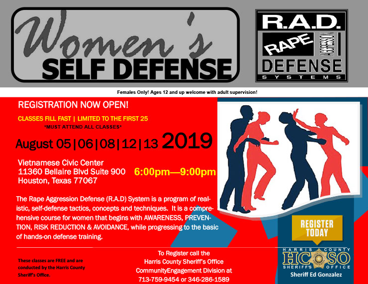 The Rape Aggression Defense (R.A.D.) System is a program of realistic, self-defense tactics, concepts, and techniques. It is a comprehensive course for women that begins with awareness, prevention, risk reduction, and avoidance while progressing to the basics of hands-on defense training.