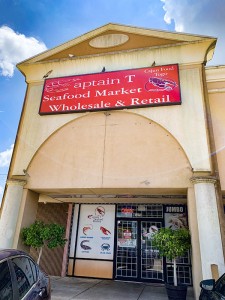 Don’t miss it, perched on the corner of the long shopping strip, as we did the first time. A bold red sign announces your destination: Captain T Seafood Market Wholesale & Retail, Cajun Food To Go. Despite their emphasis on “to go,” walking into the restaurant, we were greeted and invited to sit at one of the many tables in the open dining area, that once was a small grocery store. The remnants of the grocery store layout and features are apparent, with serve-yourself refrigerator cases lining the back wall, from which you can grab bottled (non-alcoholic) drinks. To enjoy a beer with your seafood, you’d have to bring your own; Captain T is currently BYOB.