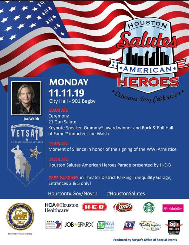 Mayor Sylvester Turner invites Houstonians to attend the Houston Salutes American Heroes Veterans Day celebration starting at 10 a.m., Monday, Nov. 11 at City Hall, 901 Bagby St.