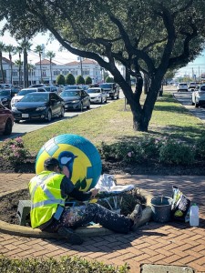 Kneeling in the middle of the median clad in a reflective yellow vest, with cups of paint and brushes beside his new spherical canvas, Armando listens to music on headphones rather than the constant distracting hum of Bellaire traffic. His first creation, a blue and orange bird with a contrasting yellow background, stares to the right as Armando completes his portrait. This sphere will serve as one of two “Welcome” markers, greeting drivers as they enter the district.