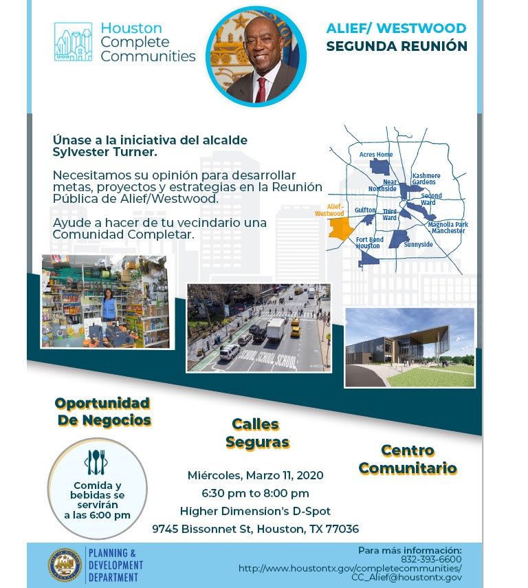 Únase a nosotros el próximo Miércoles 11 de Marzo de 2020, de 6:30 p.m. a 8:00 p.m. en Higher Dimension’s D-Spot en 9745 Bissonnet St, Houston, TX 77036 para la segunda reunión pública de Comunidades Completas Alief-Westwood. ¡Necesitamos su aporte para desarrollar metas, proyectos y estrategias para ayudar a que su vecindario sea una Comunidad Completa!