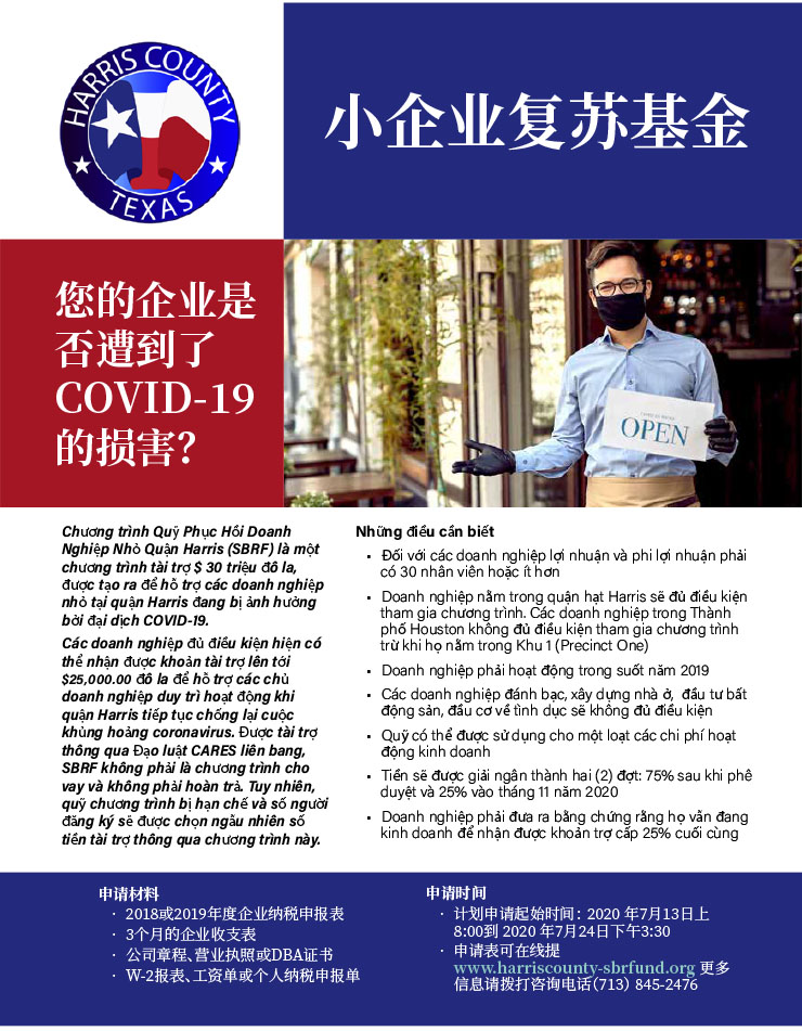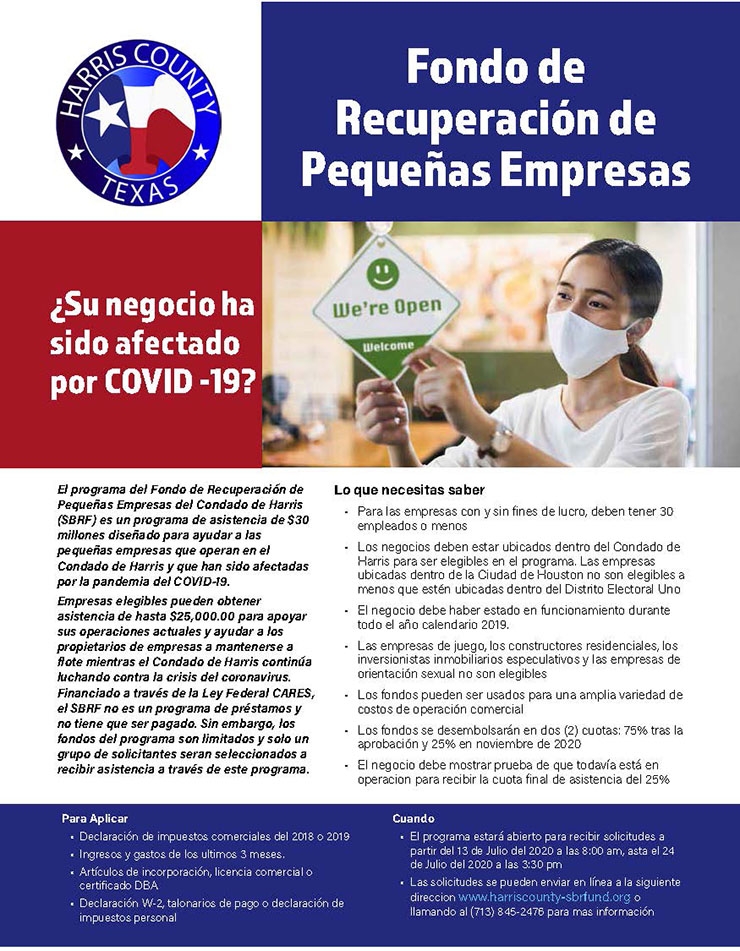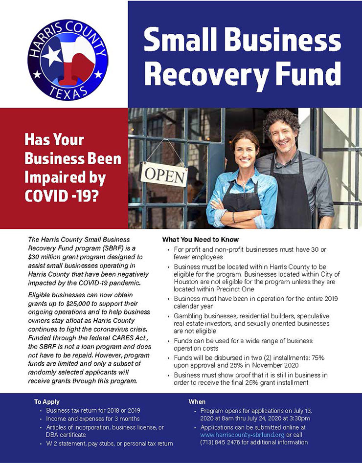 The livelihoods of working families in Harris County depend on small businesses in our area keeping their doors open. The Harris County Small Business Recovery Fund is offering eligible businesses up to $25,000 to support their ongoing operations. This is NOT a loan program, and does not have to be repaid.