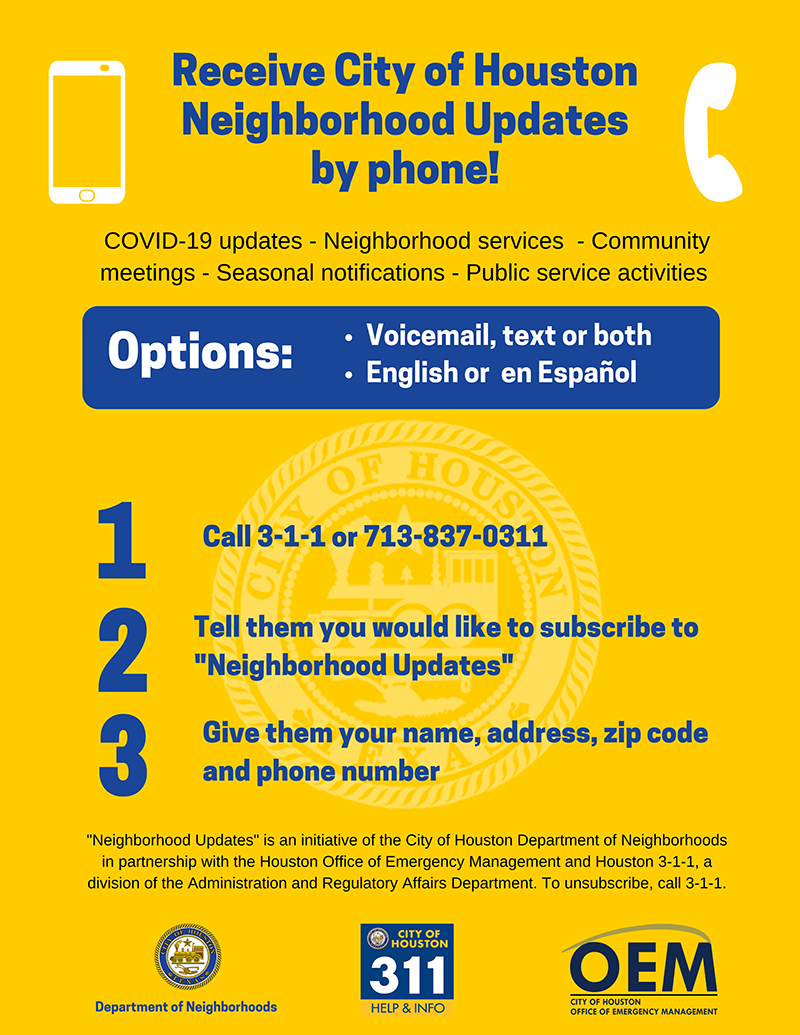 Neighborhood Updates is a service of DON administered in partnership with the Office of Emergency Management and Houston 3-1-1, a division the Administration and Regulatory Affairs Department. The broad aim of the initiative is to build stronger connections to people and communities by connecting them to a wide range of programs and services offered by city departments.