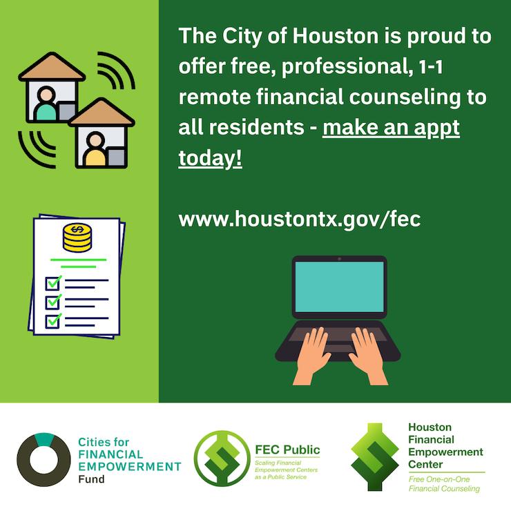 Tax Preparation – Worried that COVID-19 will complicate your taxes? Our Houston Financial Empowerment Center financial counselors will be available to assist community members with questions about how unemployment, PPP, and other COVID related relief may impact their taxes this year. Schedule an appointment at www.houstontx.gov/fec