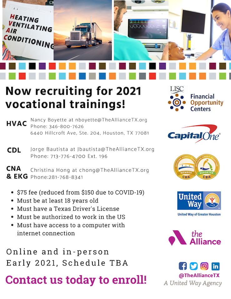 We are actively recruiting for our next CNA, EKG, HVAC and CDL classes. Please see the flyer attached for more information or visit us at www.thealliancetx.org/