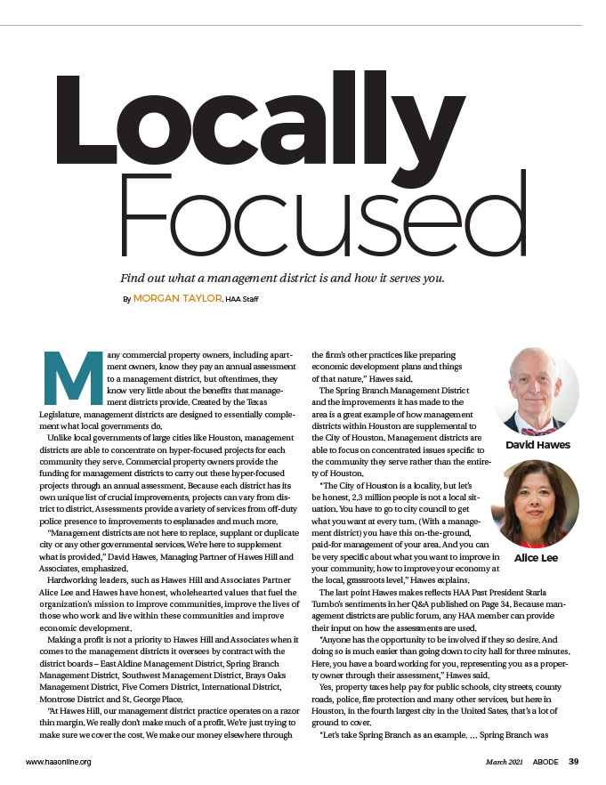 Many commercial property owners, including apartment owners, know they pay an annual assessment to a management district, but oftentimes, they know very little about the benefits that management districts provide. Created by the Texas Legislature, management districts are designed to essentially complement what local governments do.
