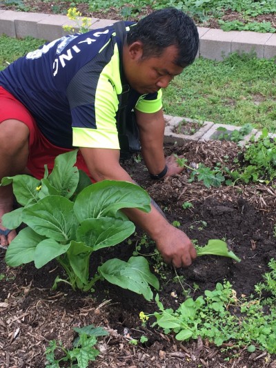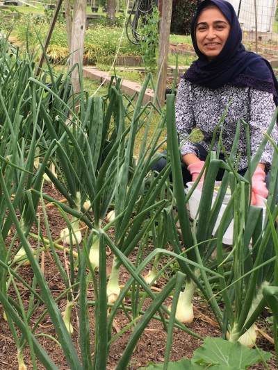 Nearby are plots belonging to several Burmese families who own the largest parcels in the community garden that volunteer Barbara Quattro helped start in 2011. Six-foot-tall wooden square frames perch over two plots, and herbaceous vines weave in and out of trellises. Eventually, the climbing vines will form a leafy canopy with goldcup flowers that will mature into warty-looking gourds used in Burmese clear broth soups and stir-fries. Adjacent to the Burmese plots, a Pakistani gardener grows onions and winter melons for use in curries.