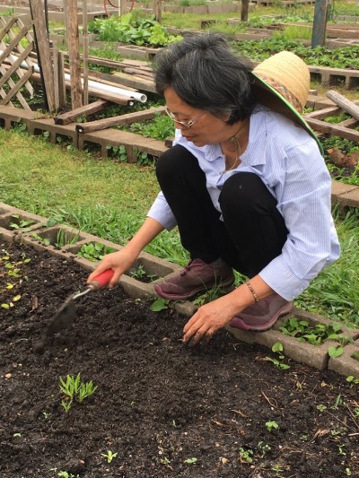 Several Vietnamese gardeners carpet their plots with Thai basil, purple perilla, lemongrass, dandelion, and sweet mint. A Nigerian grower is cultivating various peppers, tomatoes, green callaloo, or amaranth. Cabbage, squash, sweet potatoes, and peas sprout from a patch belonging to a barefoot Congolese woman.
