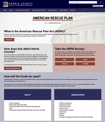 Harris County expects to receive $915M in Coronavirus Local Fiscal Recovery Funds from the US Treasury, 50% of which will be received by mid-May 2021 and 50% of which will be received one year later. Funds must be used by December 31, 2024. Additional funds may be available to Harris County residents and businesses via the state and federal government.