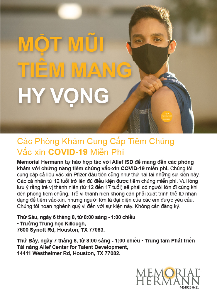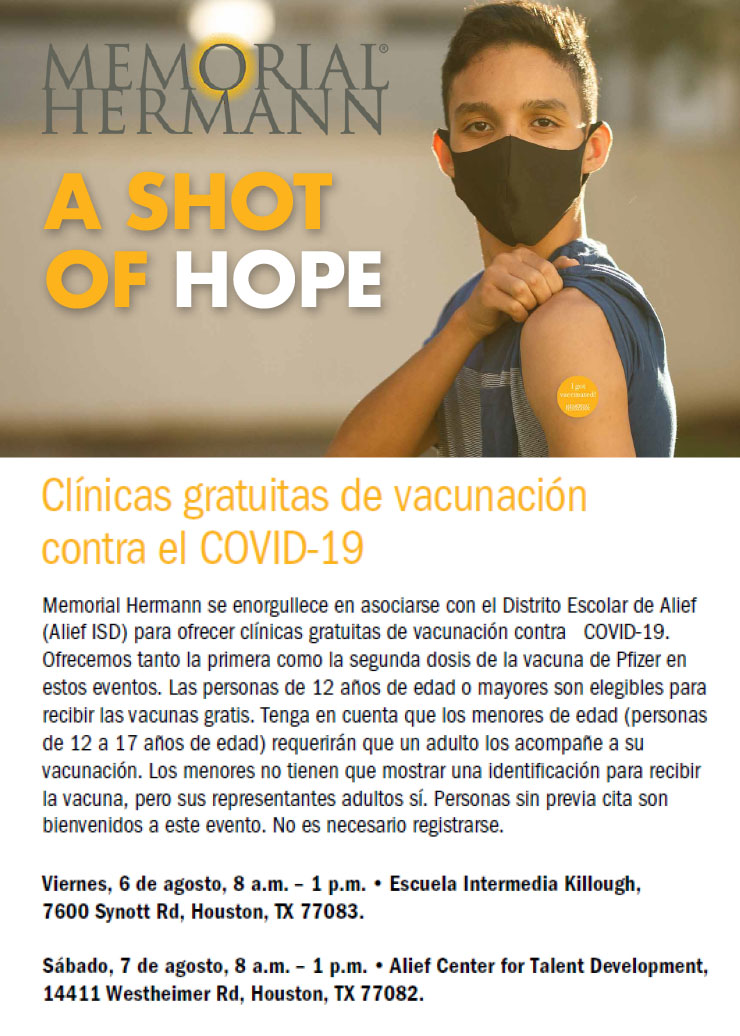 Memorial Hermann is proud to partner with Alief ISD to offer free COVID-19 Vaccine Clinics. We are offering both first and second doses of the Pfizer vaccine at these events. Individuals 12 years of age and older are eligible to receive free vaccinations. Please note that minors (individuals 12 through 17 years of age) will be required to have an adult accompany them to their vaccination. Minors do not have to show ID to receive the vaccine, but their adult representatives do.