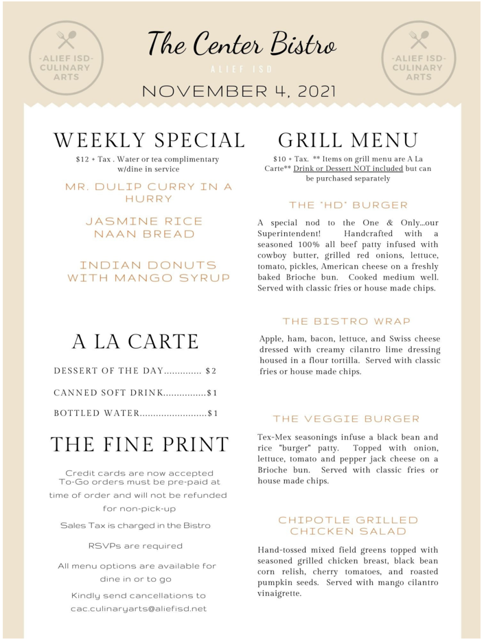 The Bistro at the Center for Advanced Careers is serving lunch Thursday, November 4 from 11:00 a.m. until 12:30 p.m.