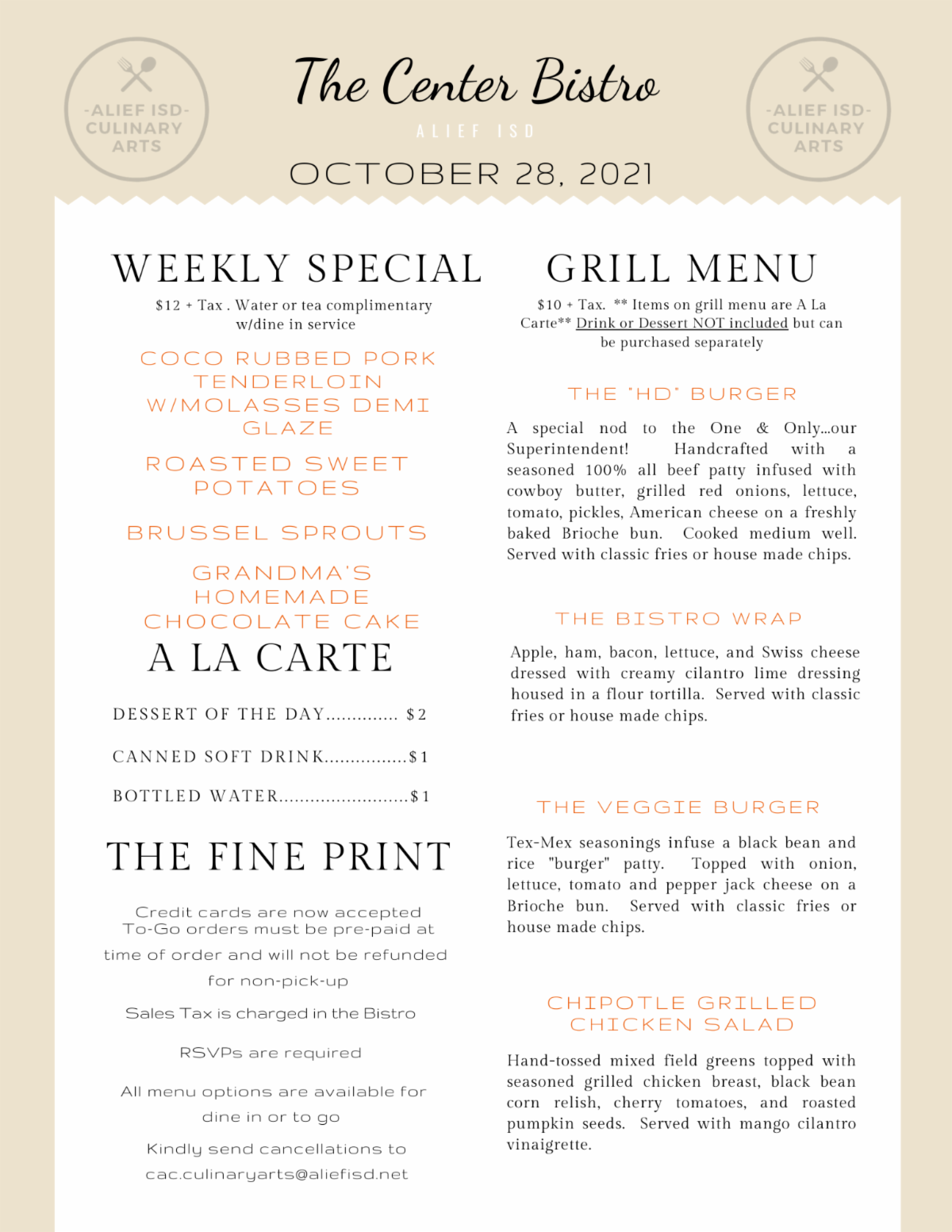 The Bistro at the Center for Advanced Careers is serving lunch Thursday, October 28 from 11:00 a.m. until 12:30 p.m.