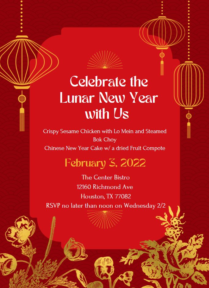 Celebrate the Lunar New Year at The Center Bistro, 12160 Richmond Avenue, on Thursday February 3 from 11:00 a.m. until Noon.
