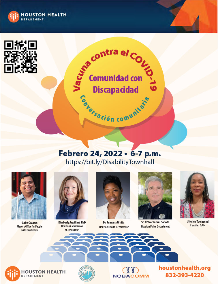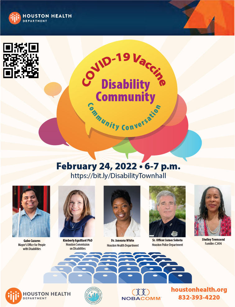 Join Houston’s Deputy Public Health Authority Dr. Janeana White and leaders from the disability community for a virtual town hall on February 24 from 6 to 7 p.m. Register at http://bit.ly/DisabilityTownhall.
