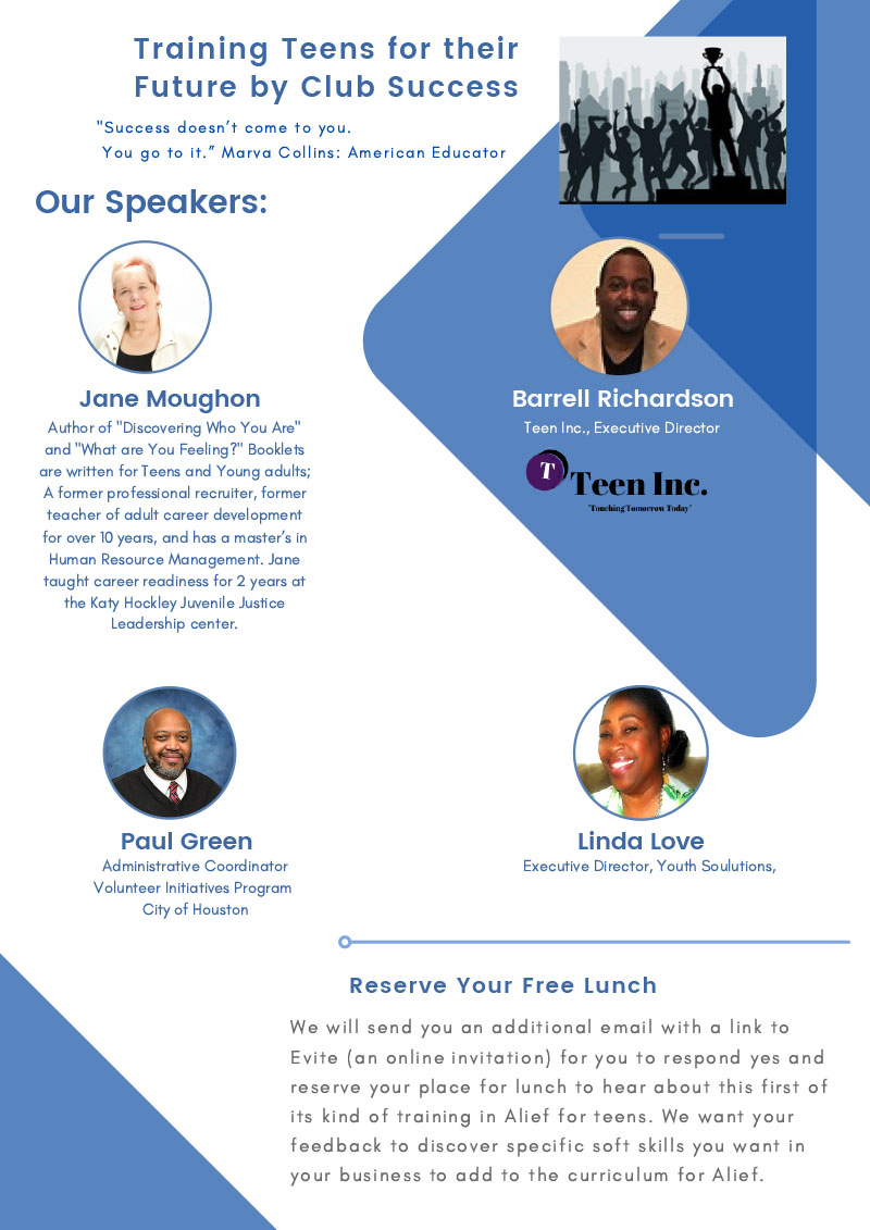 Register for this free introductory lunch to learn what “Club Success” will be offering this year to teens in Alief and how it can help your business!