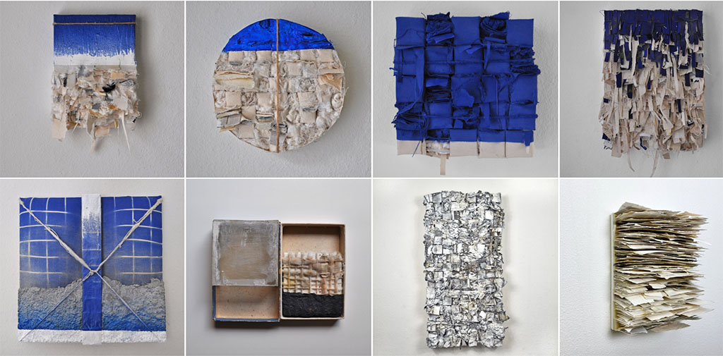 Matt: The easiest way to describe my work is that it is sculptural with multiple layers and made with reclaimed materials. They are mostly abstract with moments of texts, and historical imagery. A good number of my works use the grid format, and it discusses borders and how maps were used as a tool for imperialism and erasure.