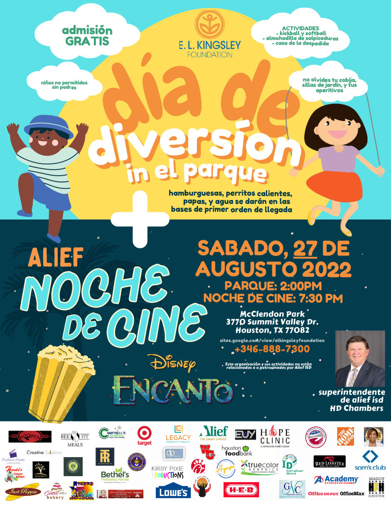 On August 27th, 2022, the E.L Kingsley Foundation is hosting a MOVIE NIGHT at MCLENDON PARK. It is going to be a FREE EVENT with food and drinks provided. Additionally, our guest speaker is going to be the Alief ISD Superintendent HD Chambers.