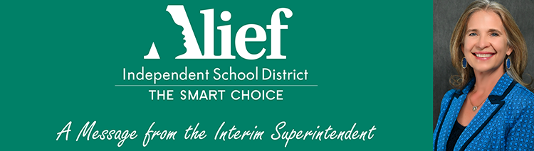Estoy orgullosa de ser parte de la comunidad de Alief y confío en que al colaborar unos con otros, continuaremos creando un futuro brillante para nuestros estudiantes. Alief tiene los maestros y el personal más dedicados y trabajadores que están comprometidos con el lema de nuestro distrito que consiste en Preparar a los estudiantes para el mañana, cuidándolos hoy. Espero trabajar con todos ustedes en el camino hacia nuestro próximo y emocionante capítulo.