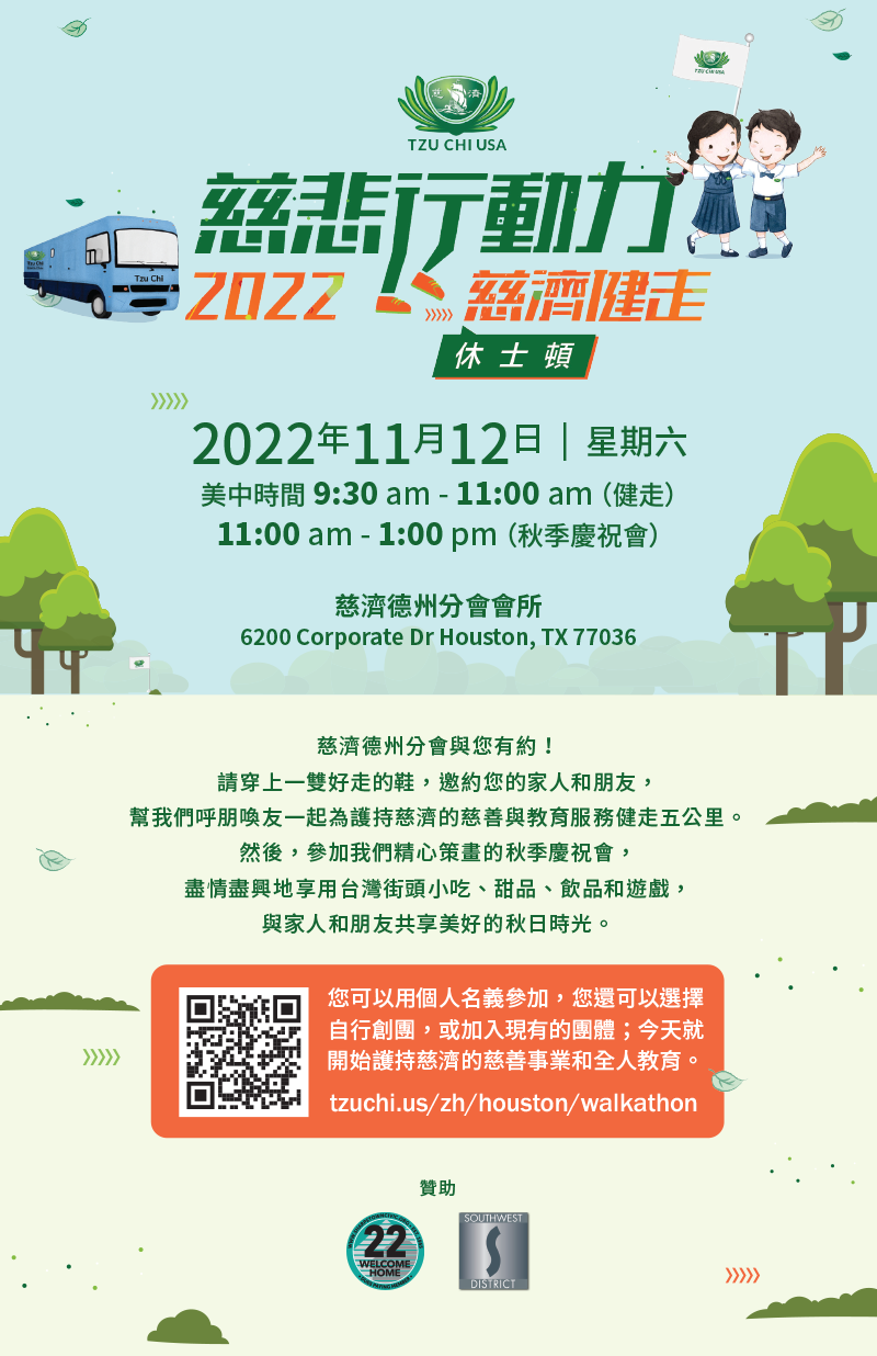 Lace up with Tzu Chi Southern Region and walk for a cause! We’ re rallying our neighbors, friends, and families for a fun 5K walk that raises awareness of and generosity towards our charity programs and education mission. Then, stick around for our Fall Festival, featuring Taiwanese street foods, beverages, sweets, and games for the whole family.