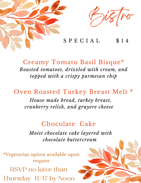 Please RSVP by November 17 at Noon. Click here to make reservations for to-go orders on November 18 – November 18 lunch