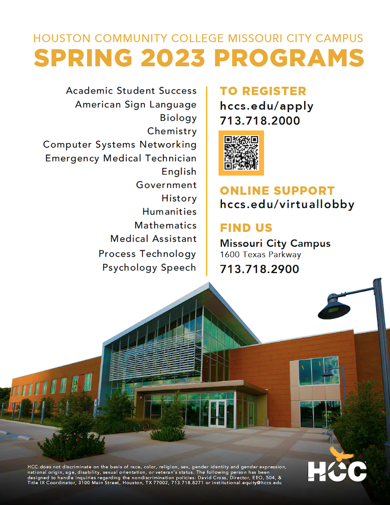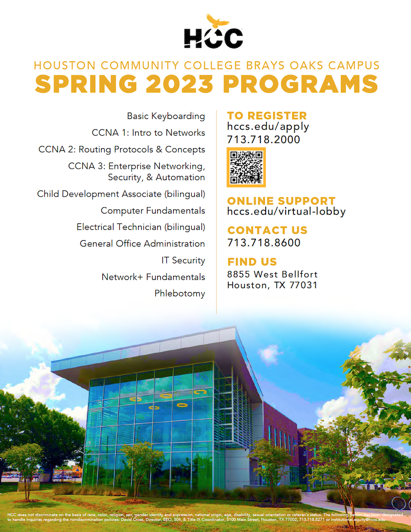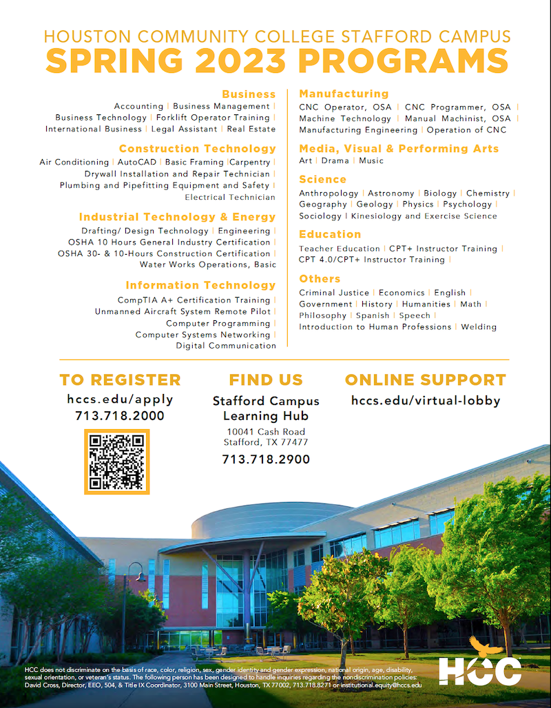 As we celebrate the holiday season, HCC is geared up for the spring! I’d like to make you aware of the new line-up of classes and programs in the New Year at HCC Stafford, Missouri City and Brays Oaks campuses.