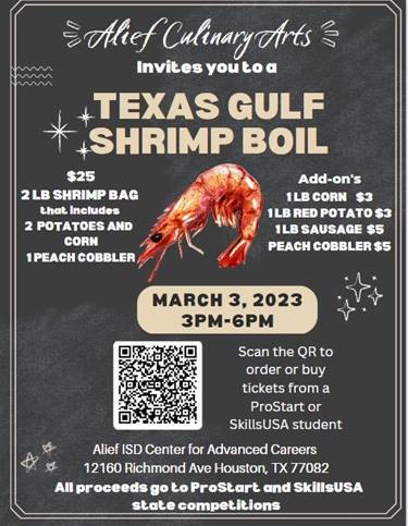 The ProStart and SkillsUSA students are doing a Shrimp boil fundraiser for our state competitions. Donations are welcomed.
