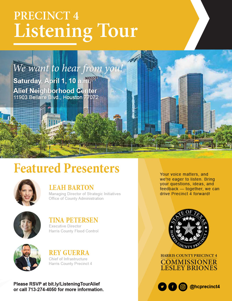 Commissioner Briones is hosting her first listening tour on Saturday, April 1st, at the Alief Neighborhood Center, 11903 Bellaire Blvd., Houston, TX 77072 in the East Room #1301. The event is from 10 am to noon.