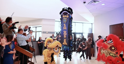 About 20 HPD officers take part in the HPD dance team, Lui noted. Dancers wear elaborate red, gold and black shimmering costumes that together magically transform into a large dancing “lion.”