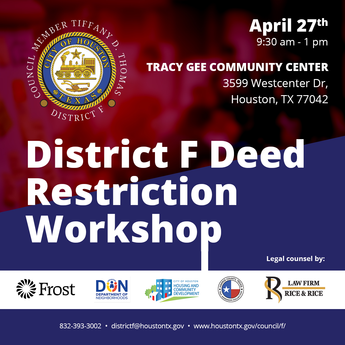 Please register here for District F’s Deed Restriction Workshop on Saturday, April 27, 2024. The event will be held 9:30am – 1pm at the Tracy Gee Community Center (3599 Westcenter Blvd, Houston, TX 77042). Presenters include: Rice & Rice Law Firm, City of Houston Legal Department, Department of Neighborhoods – Legal Hub and Inspections & Public Services, Houston Housing Department and the Harris County Tax Assessor’s Office. If you have any questions, please reach out to the District F office at (832) 393-3002 or DistrictF@houstontx.gov.