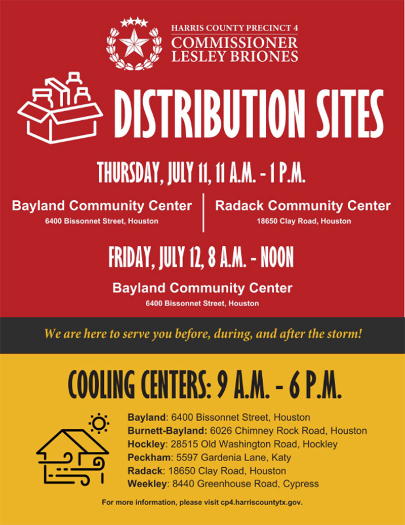 The following Community Centers will also distribute food and water supplies but will remain open during normal hours (8 a.m. – 8 p.m.) for the public to charge devices and enjoy free Wi-Fi in an air-conditioned facility:
