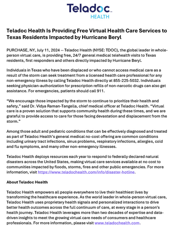 Teladoc Health is providing free, 24/7 general medical telehealth visits to Texas residents, first responders, and others directly impacted by Hurricane Beryl. Individuals can seek treatment from a licensed health care professional for any non-emergency illness by calling Teladoc Health directly at 855-225-5032. Individuals seeking physician authorization for prescription refills of non-narcotic drugs can also get assistance.