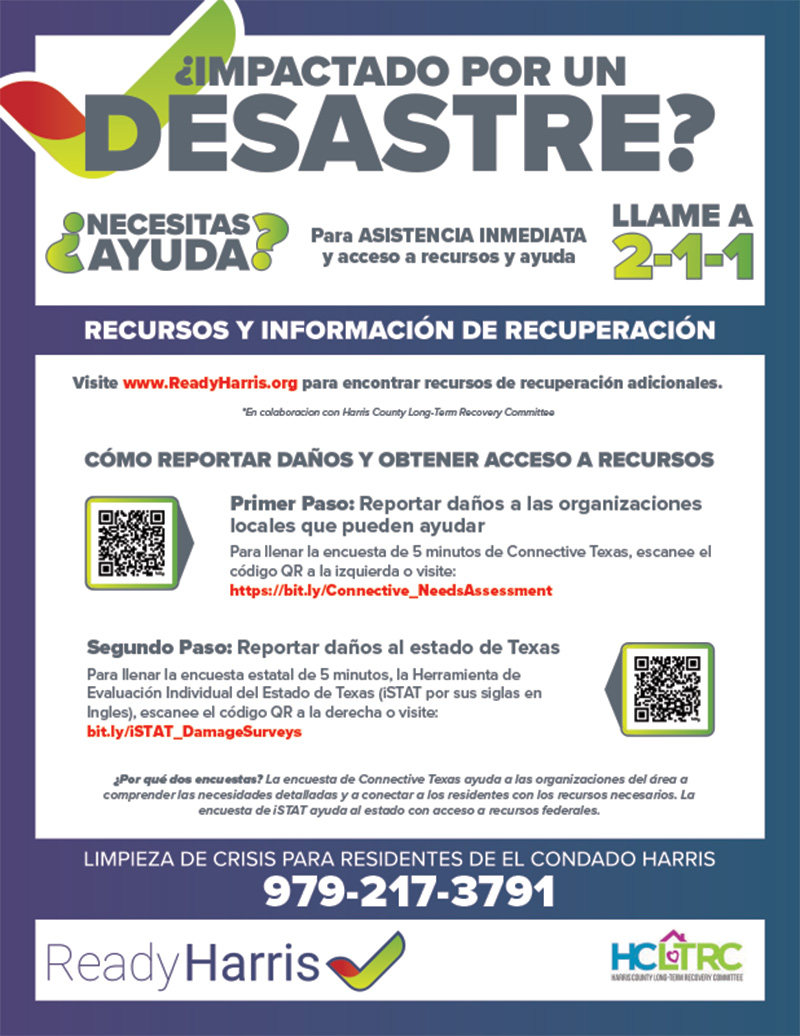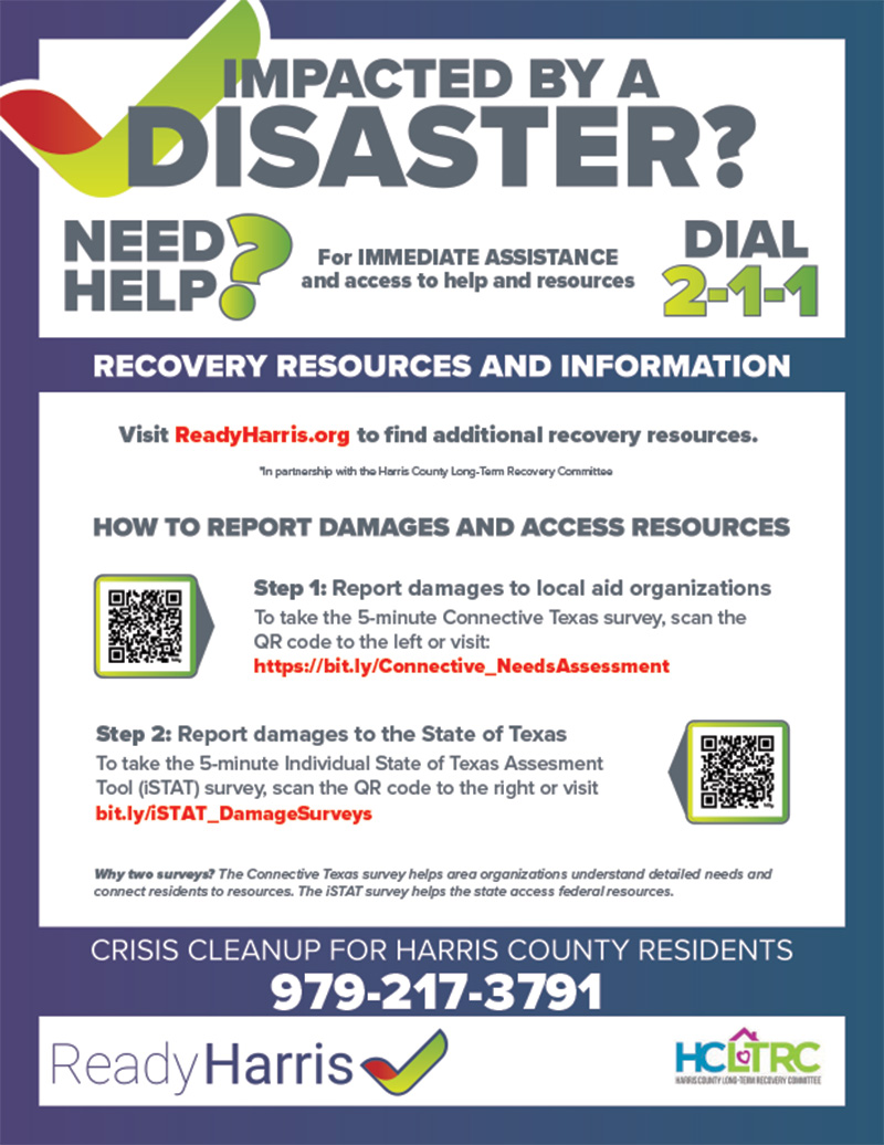 - For debris removal help, contact the Crisis Cleanup hotline at 832-509-2977.