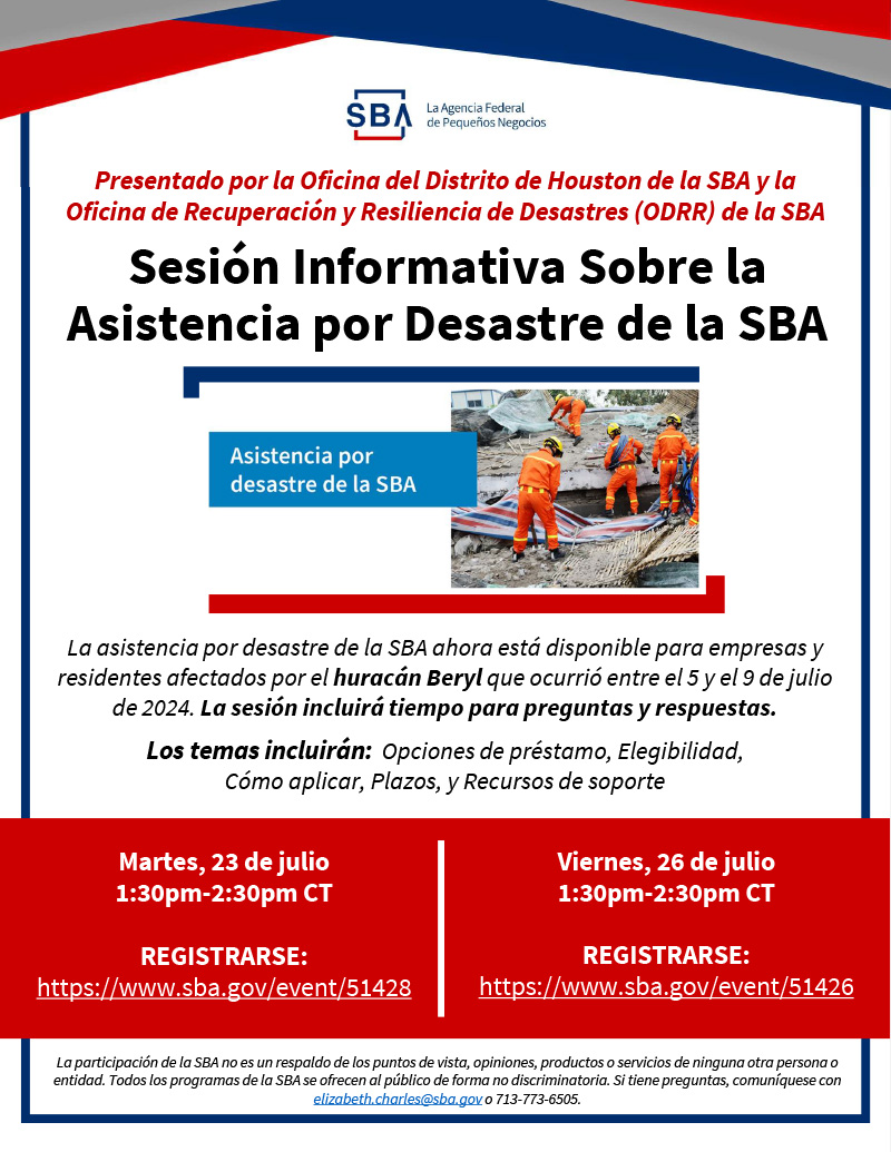 - Tuesday, July 23rd @ 1:30pm: Sesión Informativa Sobre la Asistencia por Desastre de la SBA | U.S. Small Business Administration
