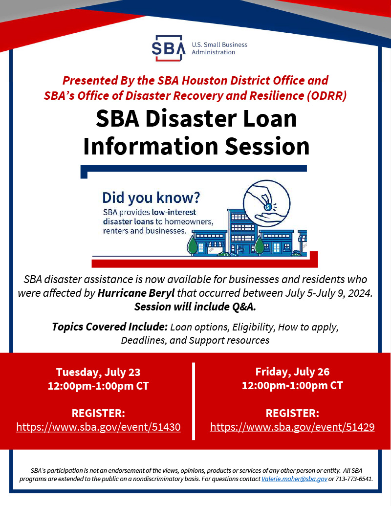 - Friday, July 26th @ Noon: SBA Disaster Loan Information Session | U.S. Small Business Administration