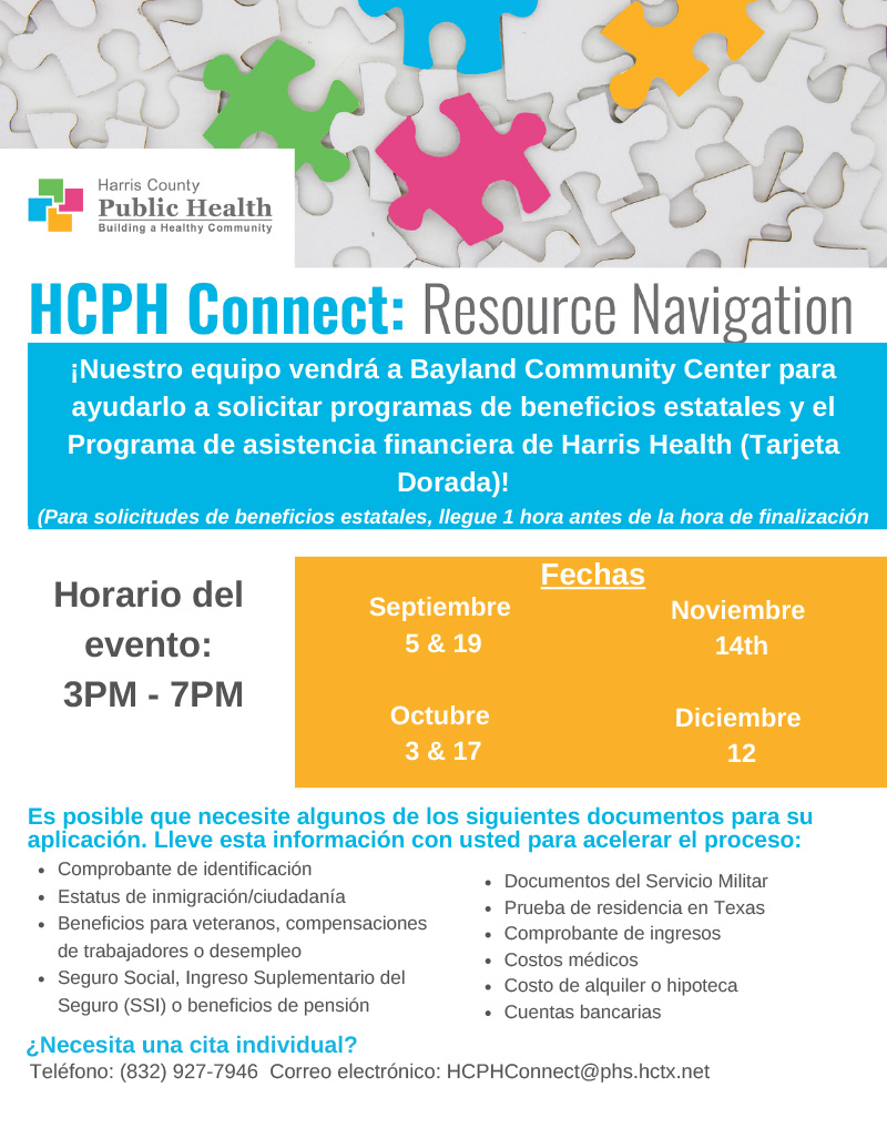 ¡Nuestro equipo vendrá a Bayland Community Center para ayudarlo a solicitar programas de beneficios estatales y el Programa de asistencia financiera de Harris Health (Tarjeta Dorada)!