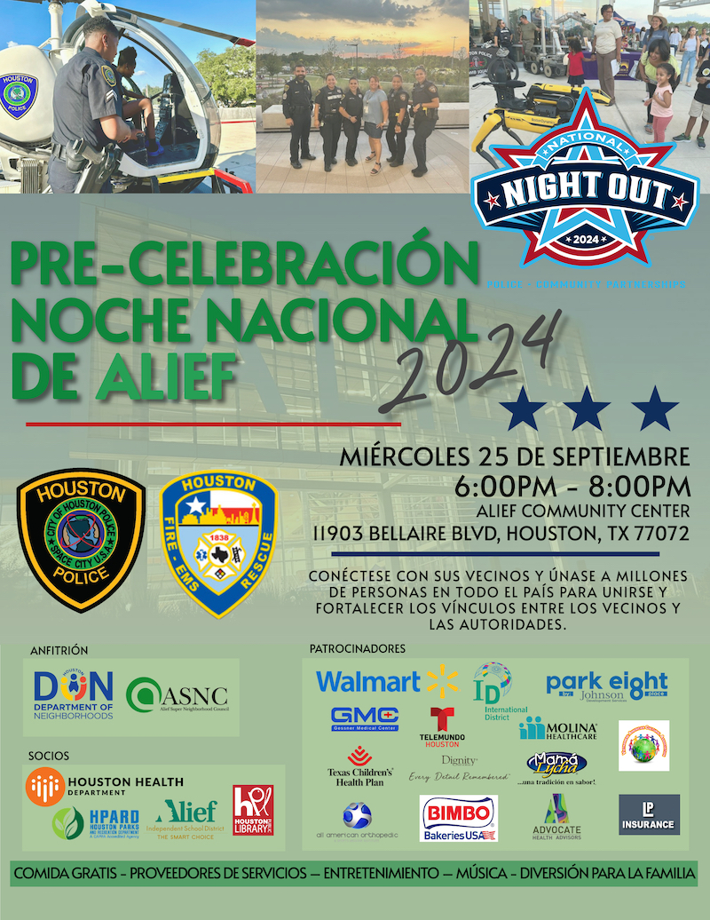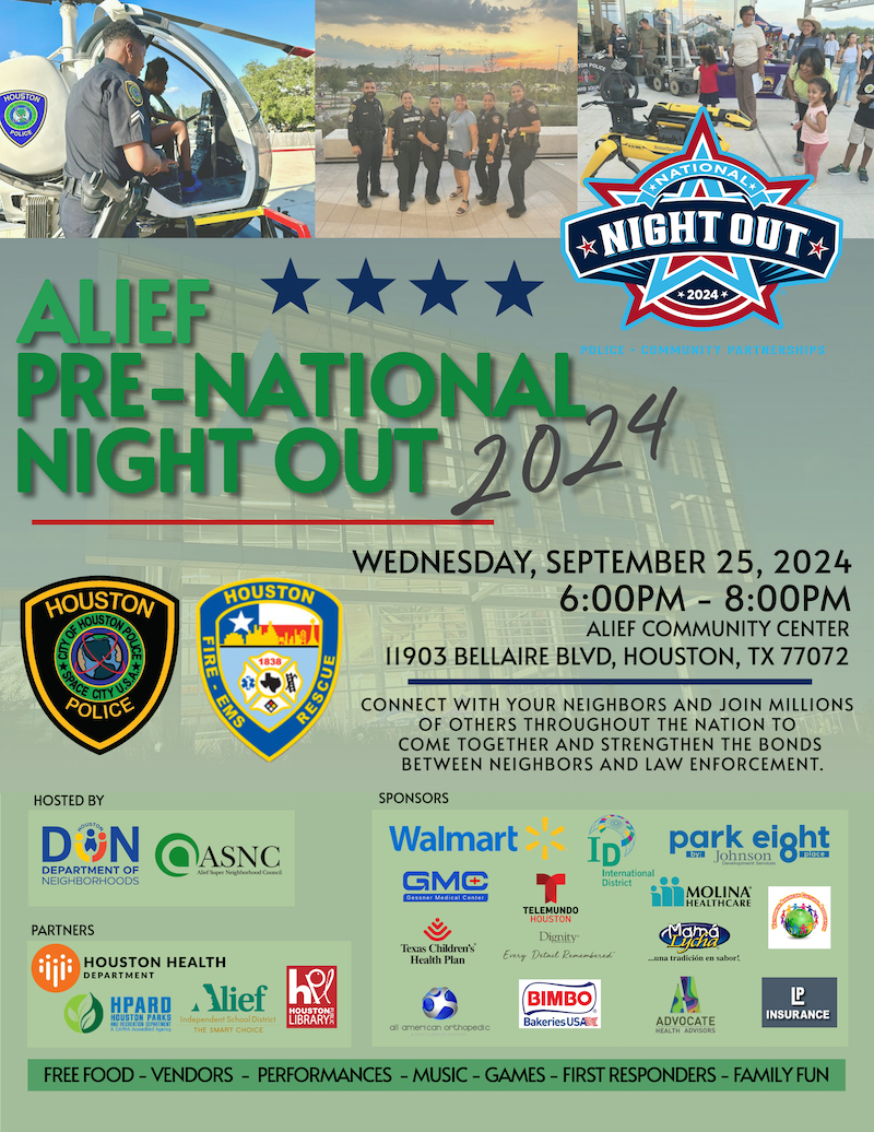 This year, the City of Houston’s Department of Neighborhoods (Mayor’s Assistance Office) and the Alief Super Neighborhood Council are hosting their 2nd Annual Alief Pre-national Night Out event to be held Wednesday, September 25th at the new Alief Neighborhood Center. Like other National Night Out events, their event will offer an opportunity for residents to get acquainted with each other and the police and fire personnel who serve them.