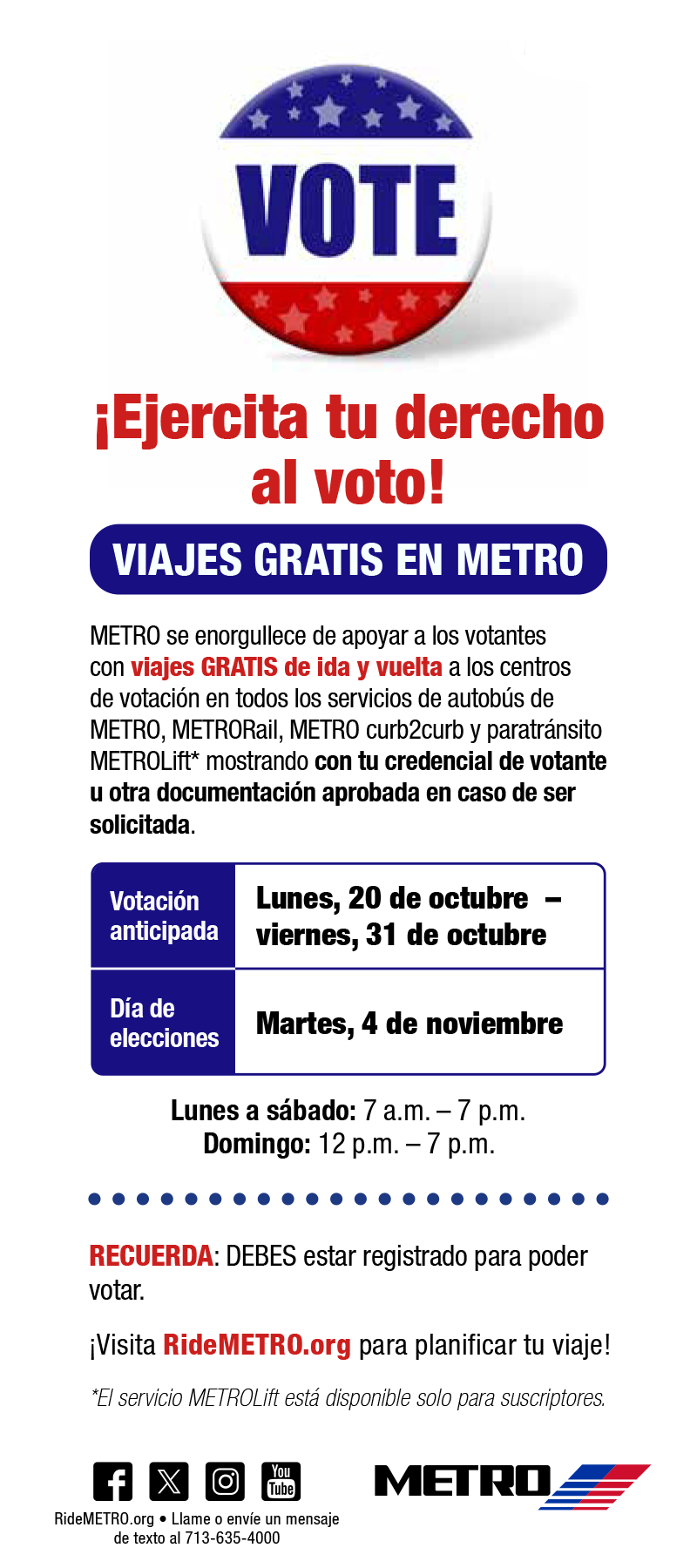 METRO is proud to support voters with FREE, round-trip travel to the polls on all METRO local bus, METRORail, METRO curb2curb and METROLift* paratransit service by showing your voter ID or other approved documentation upon request.